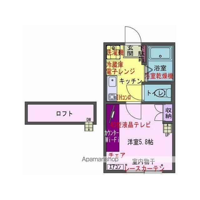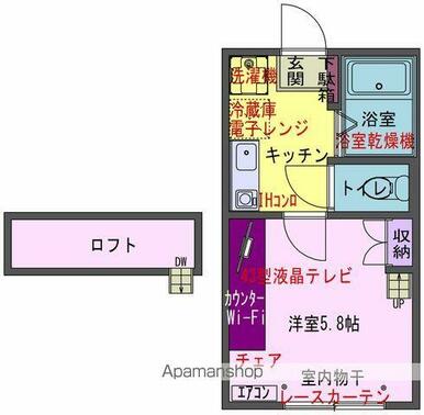 | 設備 | バス・トイレ別室 室内洗濯機置場 モニタ付インターホン 冷蔵庫 IHクッキングヒーター 浴室乾燥機 シャワー 洗濯機置場 ロフト 給湯 フローリング プロパンガス エアコン 駐輪場 照明器具 インターネット使用料無料 | ||